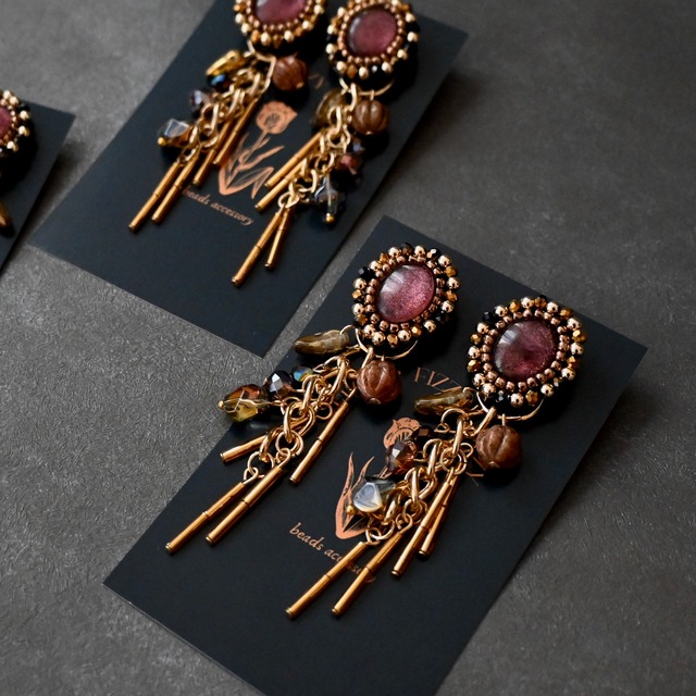 【商品説明】 艶やかなオーバルストーンを主役に、深いピンクのビーズで縁取ったクラシカルで神秘的なデザイン。 中心のストーンは、光の角度によって色味が変化し、まるで宇宙のような奥行きを感じさせます。 下にはメタルチェーンや天然石風のビーズ、ゴールドパーツが組み合わさり、動きの中で多彩な表情を見せてくれます。 落ち着いたカラーリングながらも存在感は抜群で、シンプルな装いにアクセントとして取り入れるのもおすすめです。 ビーズを1粒づつ丁寧に縫い付けながらモチーフを制作しています。 モチーフの下に付いているビーズのタッセルも手作りしています。 他にはない、煌びやかなアクセサリーになるようデザインしています。 使用しているビーズは全て日本製の形の整っている高級ビーズを使用しています。 作品一つ一つ心を込めて制作しているため数を作れません。 【使用金具】 ピアス:サージカルステンレス イヤリング:ニッケルフリー 2wayで使えるタイプになっており ピアスはキャッチに、イヤリングは蝶バネタイプにマルカンで下のデザインが取り外せるようになっています。 イヤリングにはシリコンカバーが付いており、耳が痛くなりずらく、滑り落ちにくいです。 【注意書】 強い摩擦、汗や水によって色落ち、時間経過による変色がある場合がございます。 金具はアレルギー対応のものを使用しておりますが、肌の異変を感じた場合は使用を控えてください。 【発送に関しまして】 購入確定後、3日以内に発送致します。 【ラッピング】 リボンとお渡し用の袋をご用意しております。(無料) 必要な方はメッセージ欄に"ラッピングあり"とご記入下さい。 2025年SSコレクションは他にもございます。 #Fizzy2025ss と検索していただくと他のデザインもご覧いただけます。