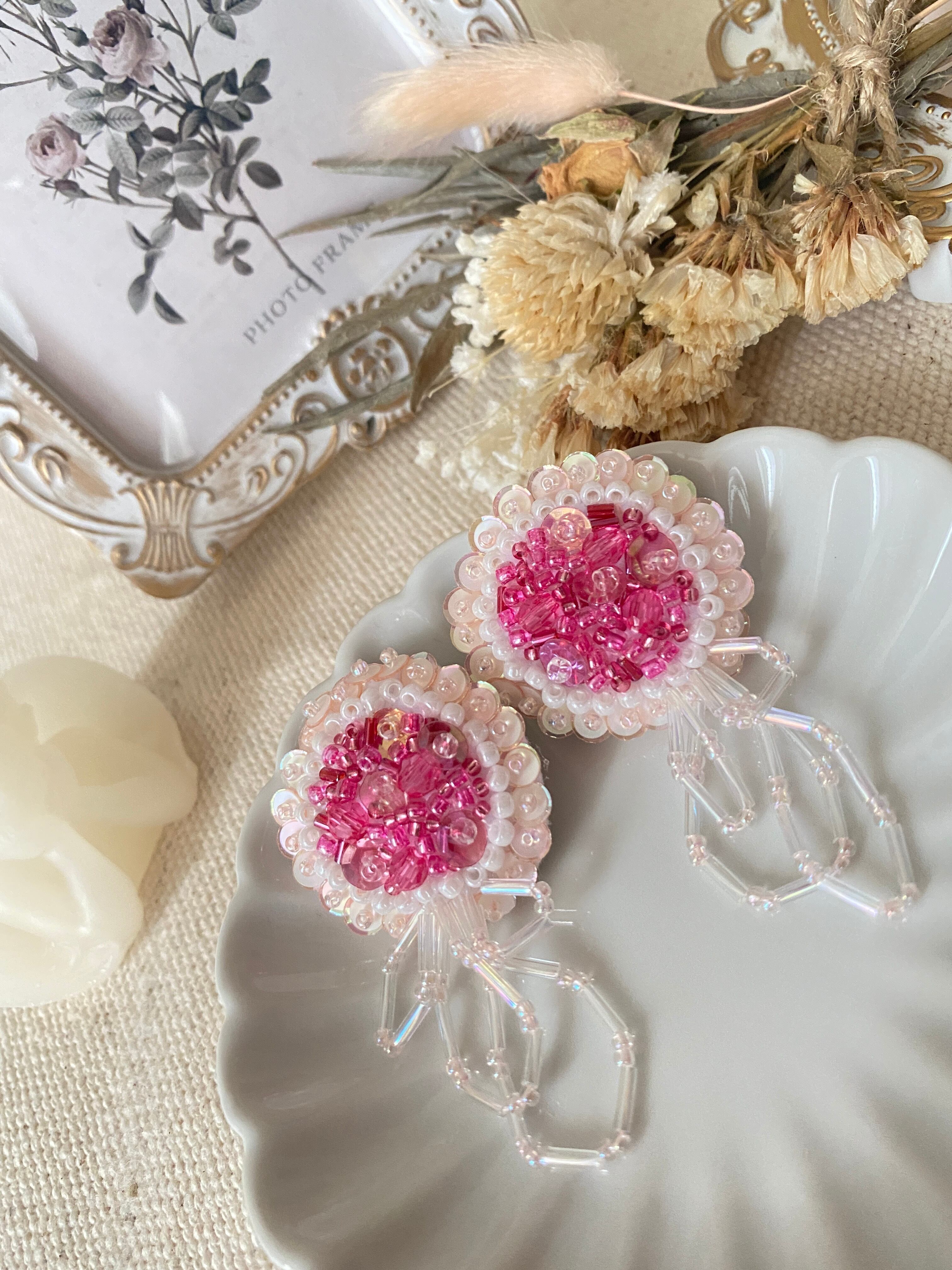 ピンクのビーズをふんだんに詰め込んだピアスです。