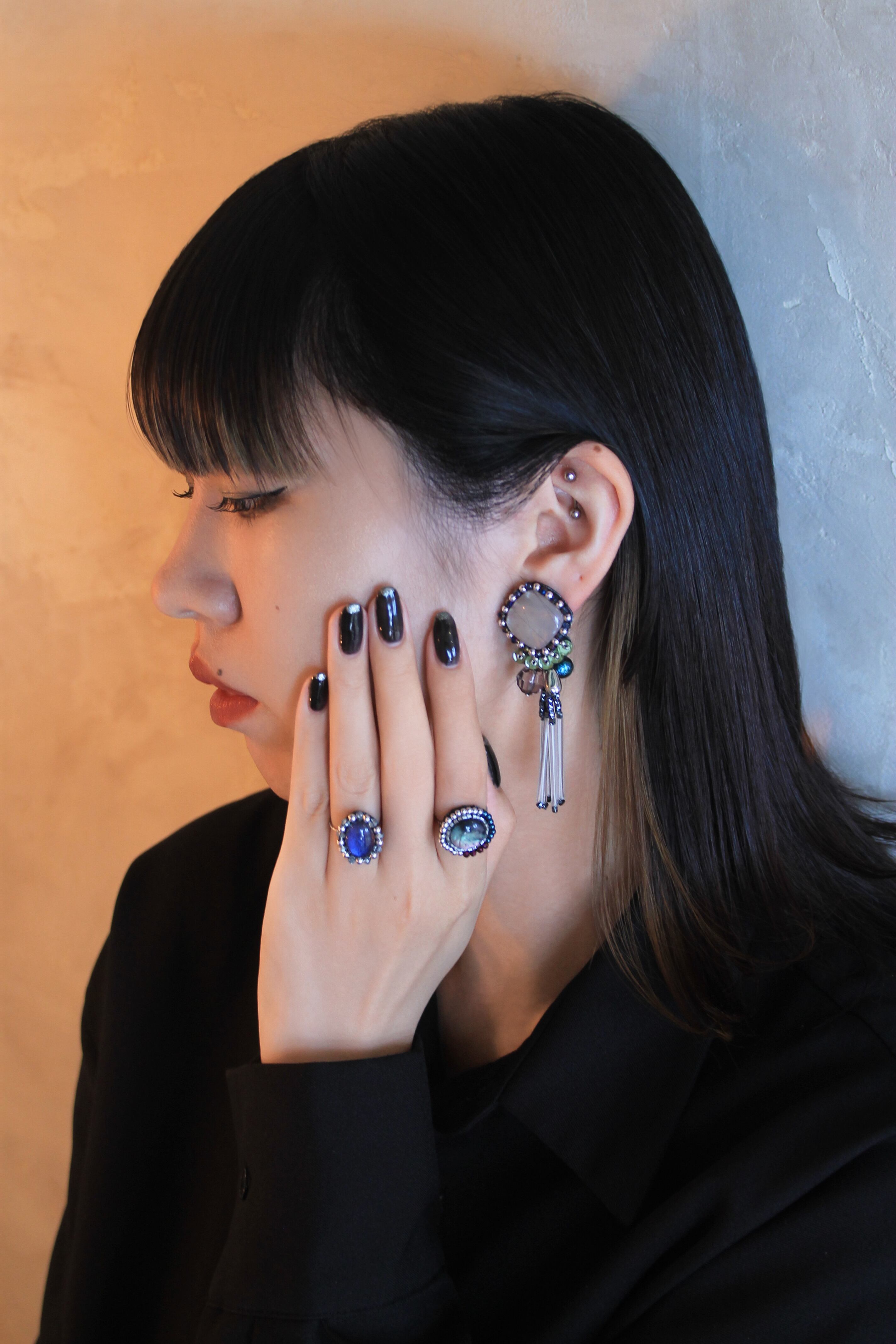 グレージュカラーのシェル風スクエアモチーフが耳元でも主張しすぎず上品に輝いてくれます。
