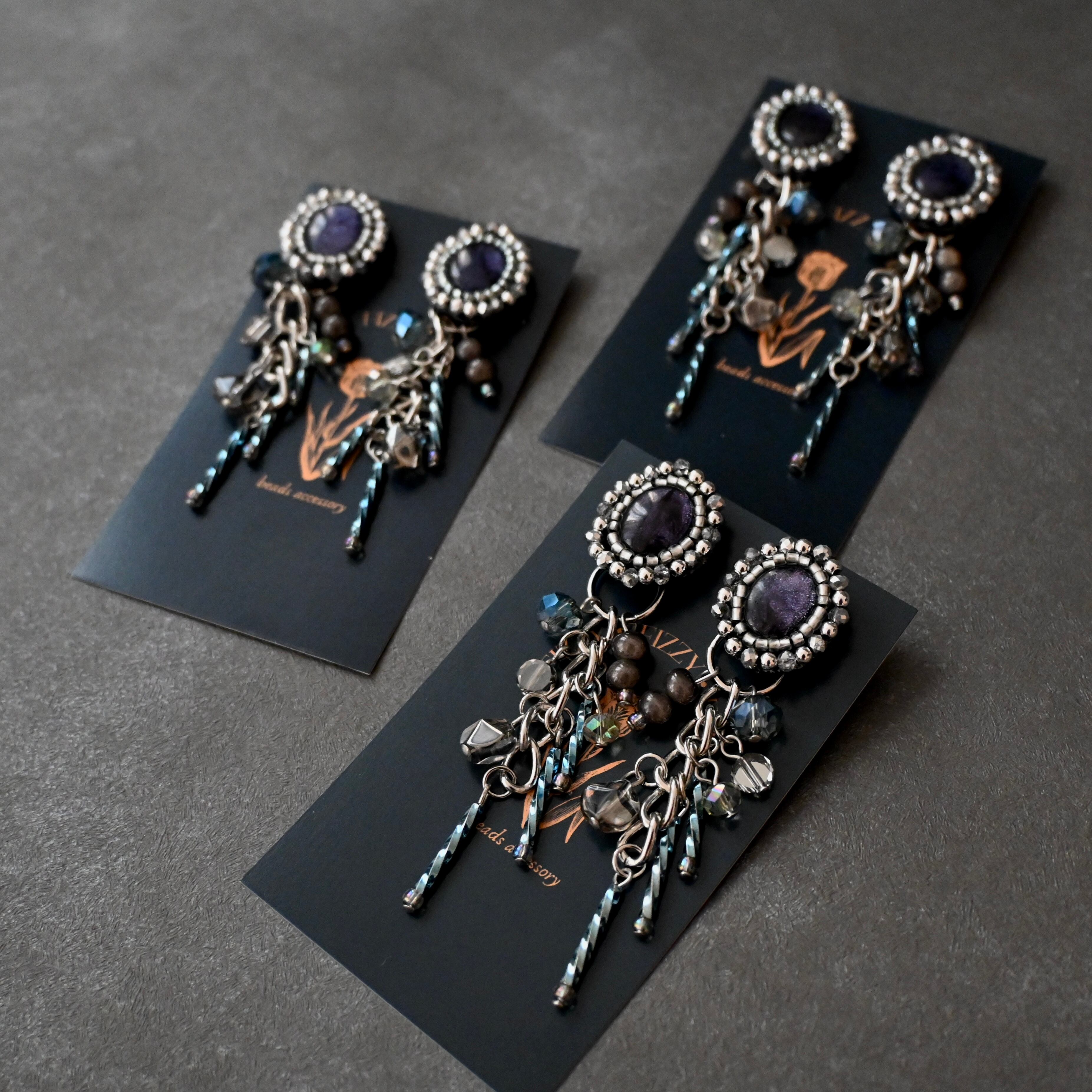 アンティーク風・ヴィンテージ風のデザインが魅力的な、ビーズ刺繍ピアスを心を込めて一つ一つ手作りしました。繊細な刺繍と豪華なビーズの組み合わせが、どんなスタイルにも華やかさをプラスします